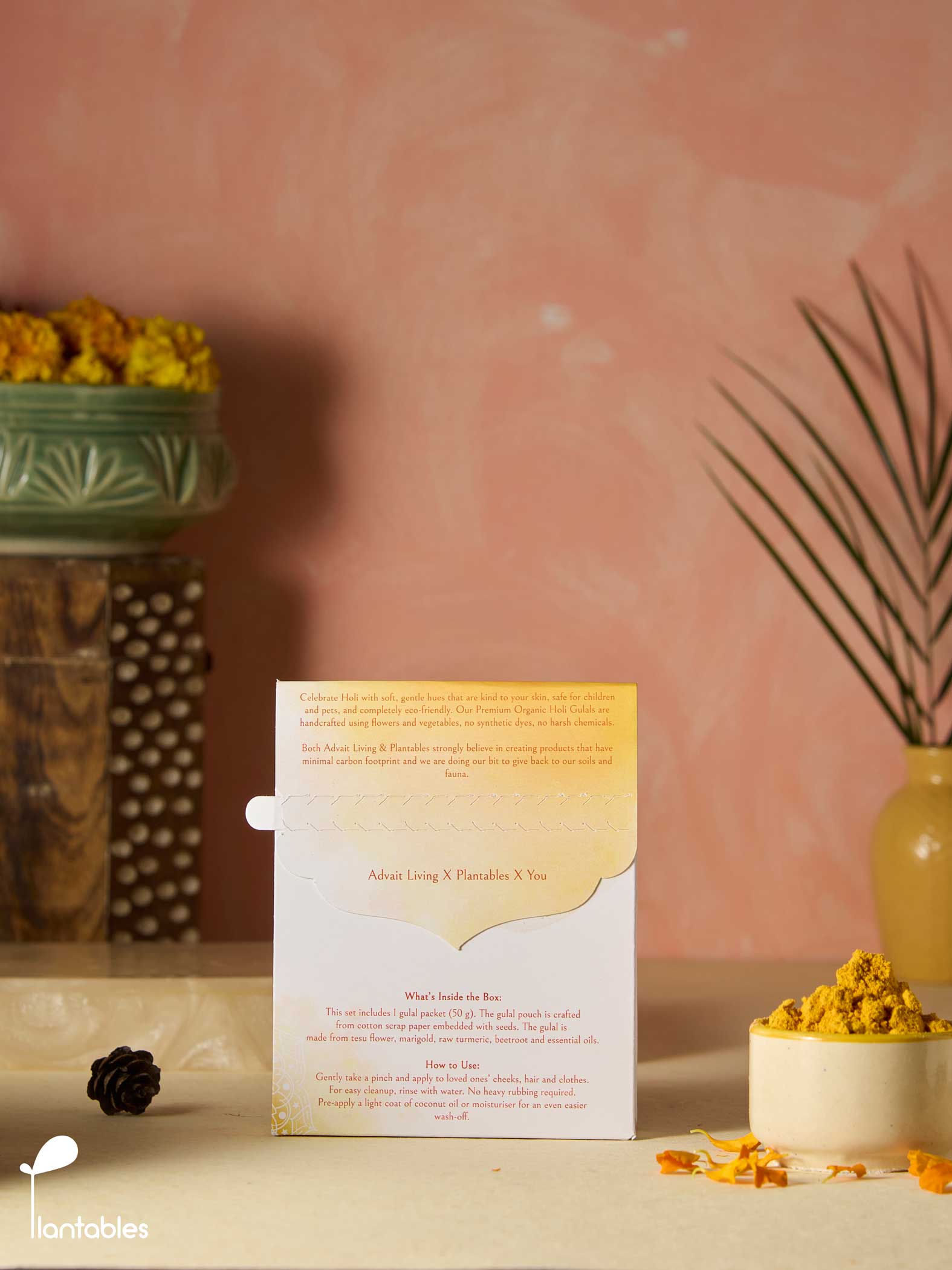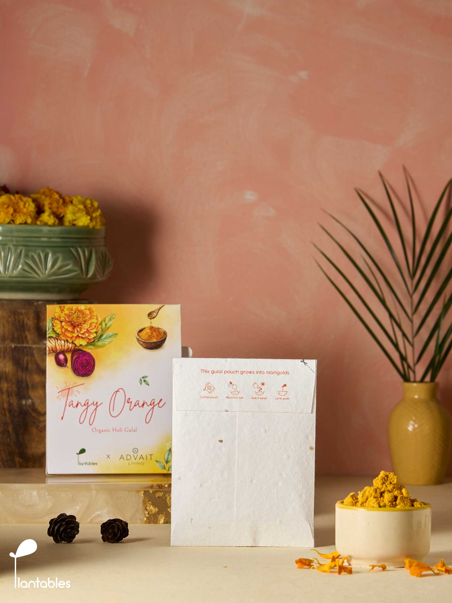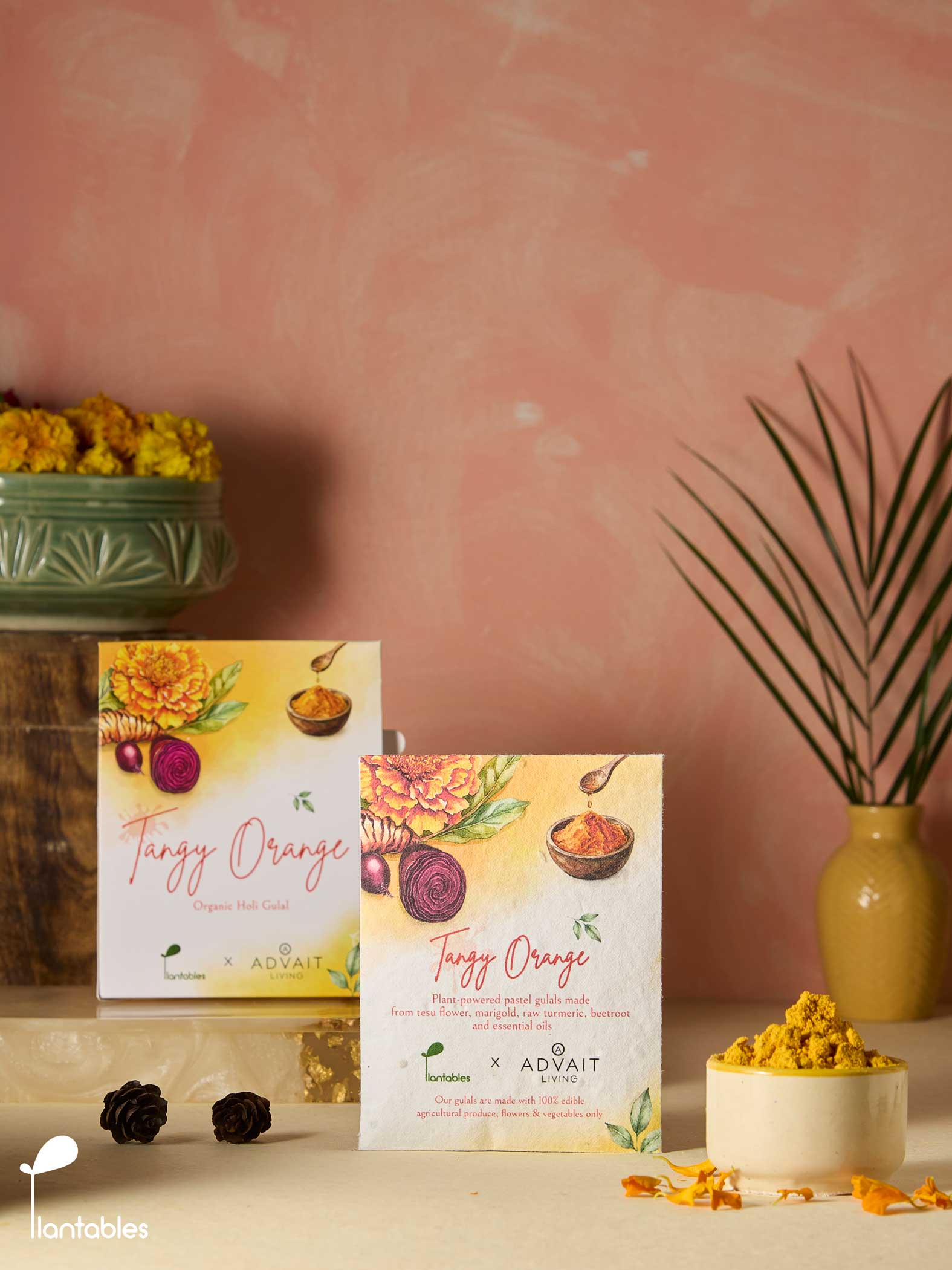 This Tangy Orange gulal is made from tesu flower, marigold, raw turmeric, beetroot and essential oils.